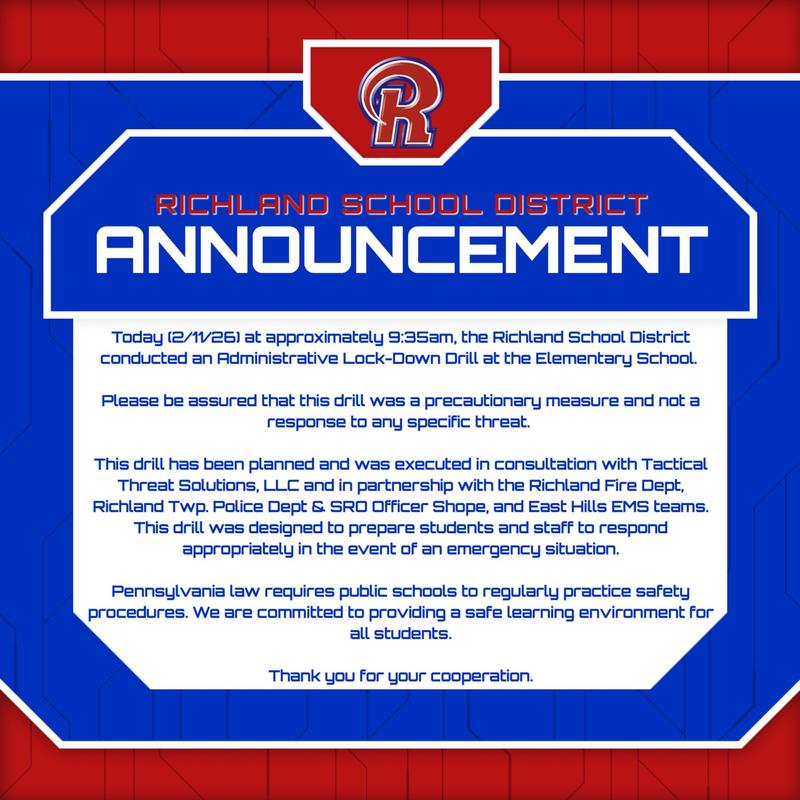 Due to inclement weather, the Richland School District will be closed today, Tuesday, January 27, 2026.